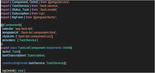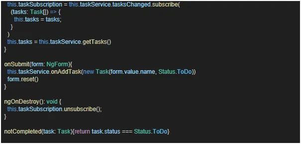 These contains methods that implements logic for the component’s template. ngOnInit is a lifecycle hook in angular and initializes tasks and data for the component. ngOnDestroy contains code that is executed just before the component is destroyed. In this instance, we have unsubscribed from an observable. Observables are used to handle asynchronous operations.