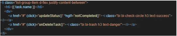 In this template we can also see the use of the click event listener in angular, here a function is executed when the said element has been clicked by a user.