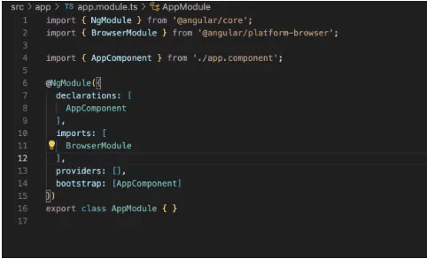 Here we can see two in-built modules in angular, BrowserModule makes it possible to run browser applications, while FormsModule provides functionalities necessary for creating template-driven forms.
